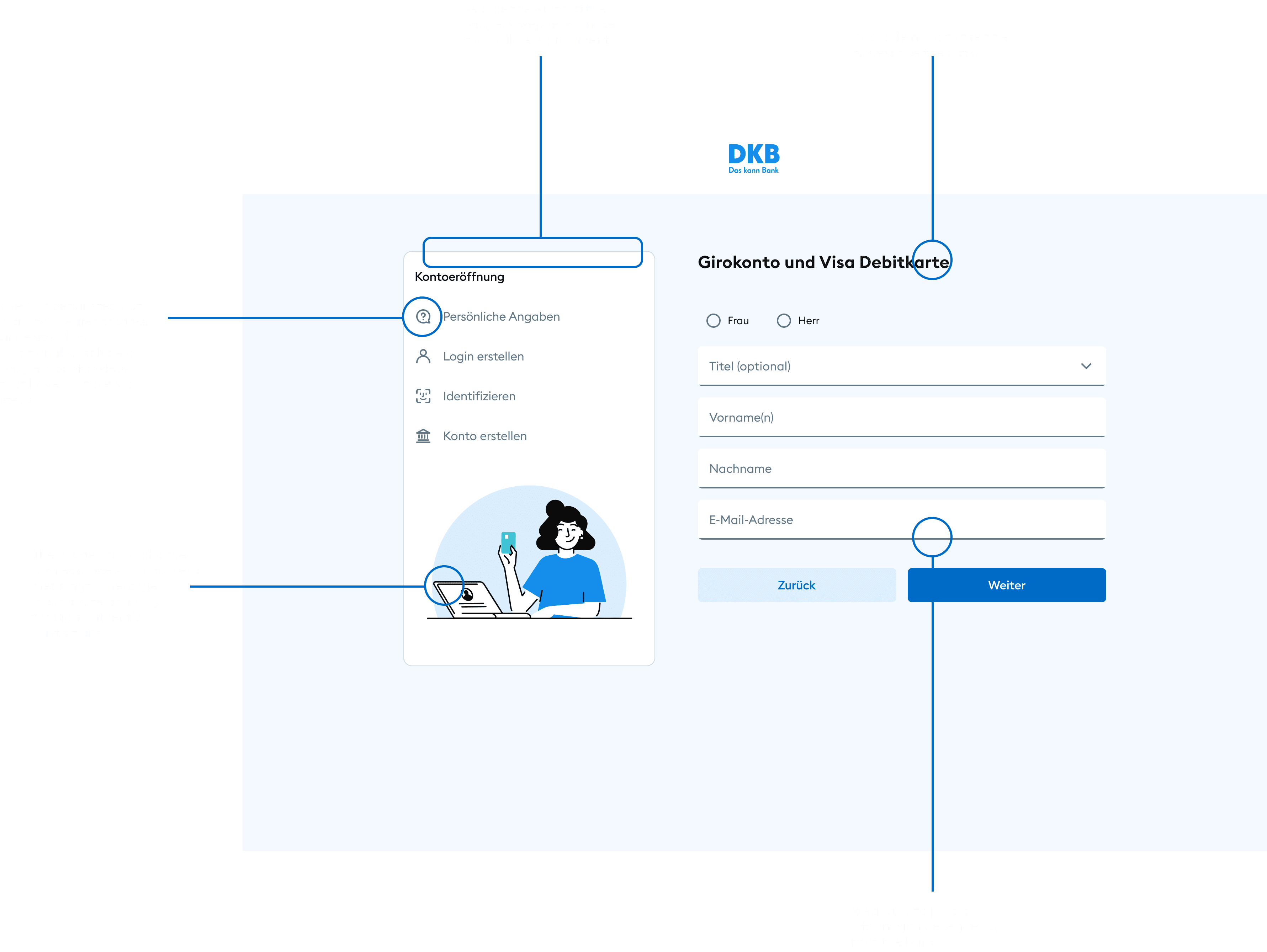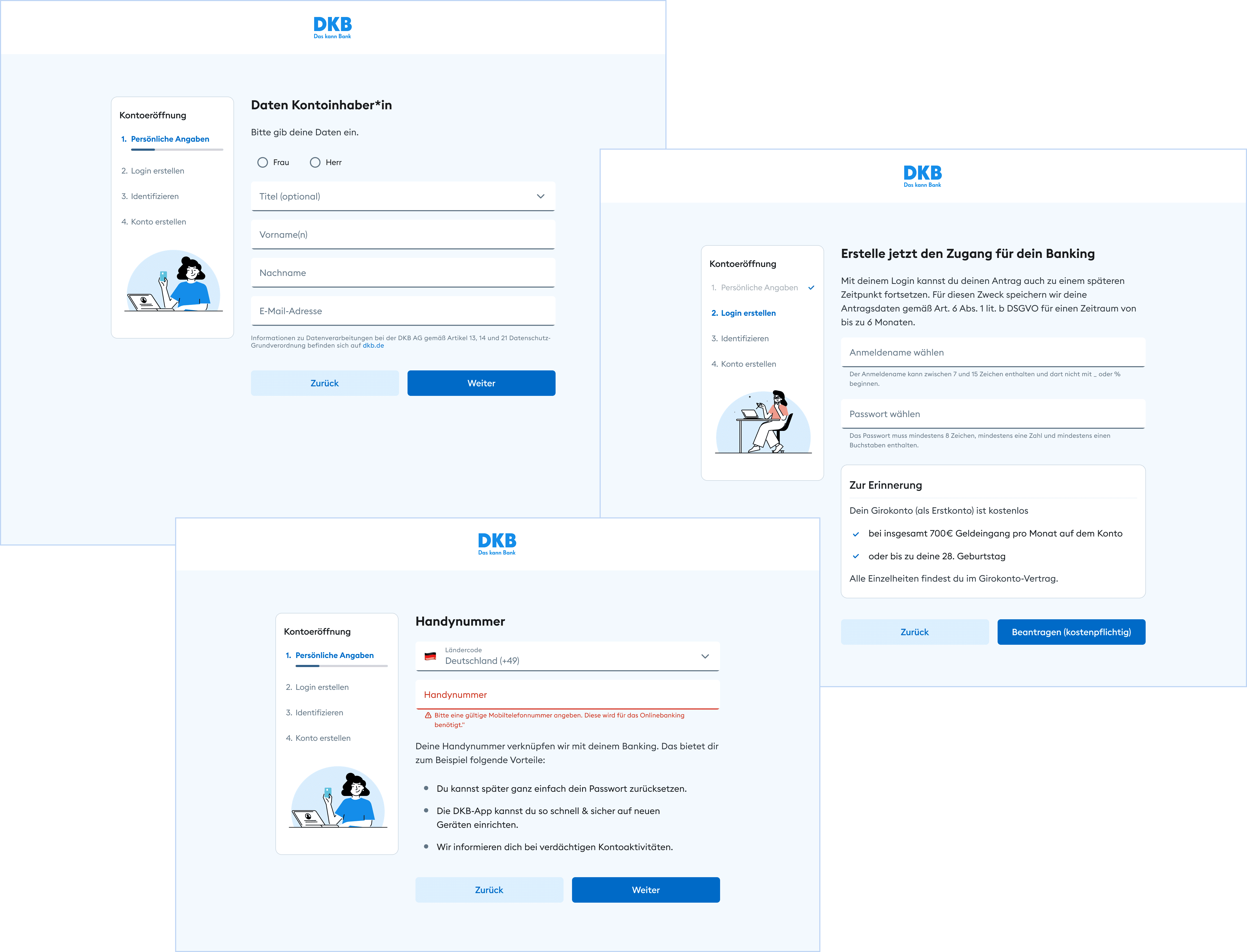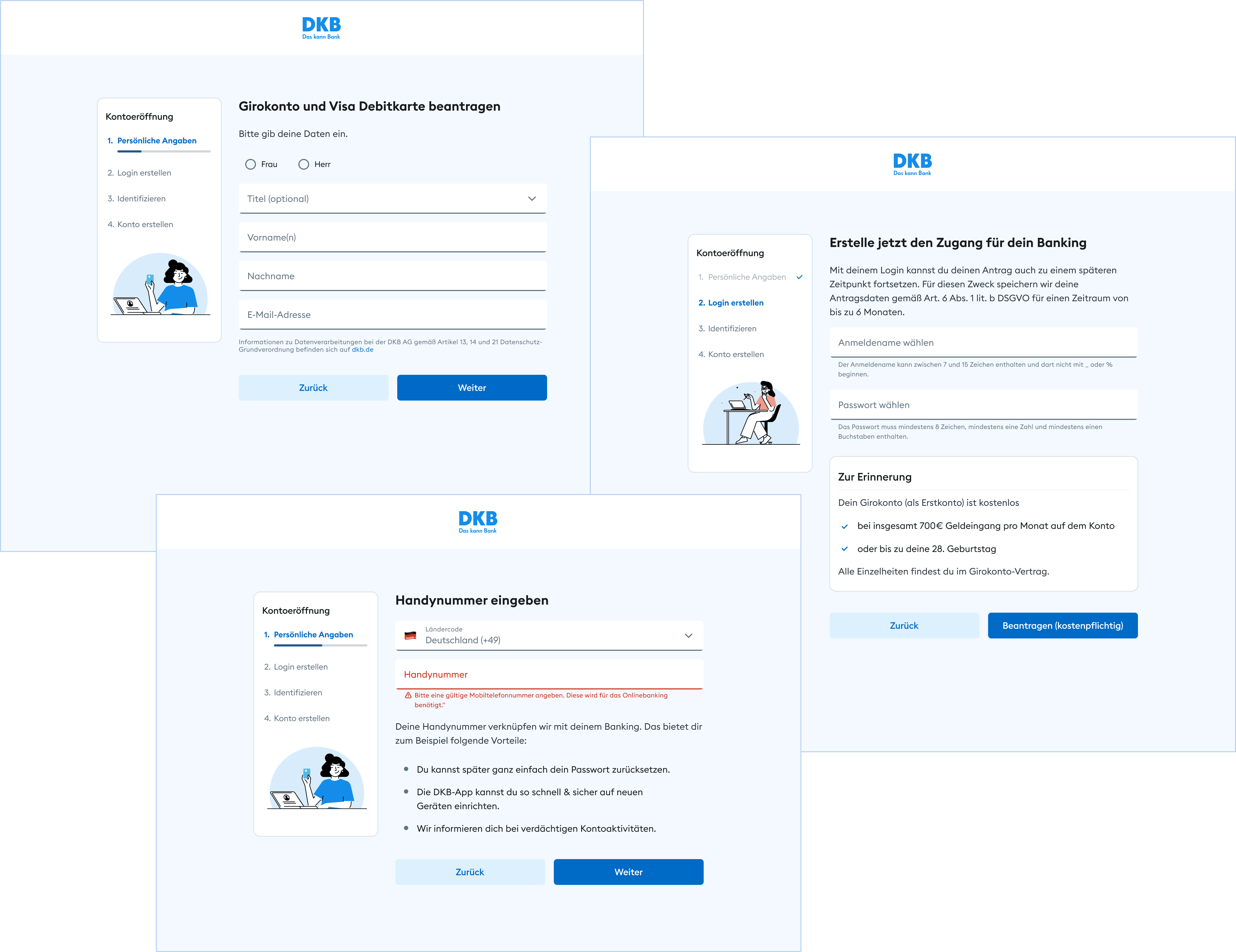 I joined the project during the MVP phase to refine and stabilize the web onboarding flow for the DKB Bank account. I reworked the UI/UX, improved the information architecture, and ensured clean, structured design files for a clear and efficient developer handover.